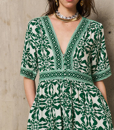 Ce travail d’orfèvre s’appuie sur le savoir-faire textile de la maison : chaque imprimé est pensé pour dialoguer avec la matière (voile de coton, soie, lin, viscose…), pour vivre en mouvement, et pour durer.