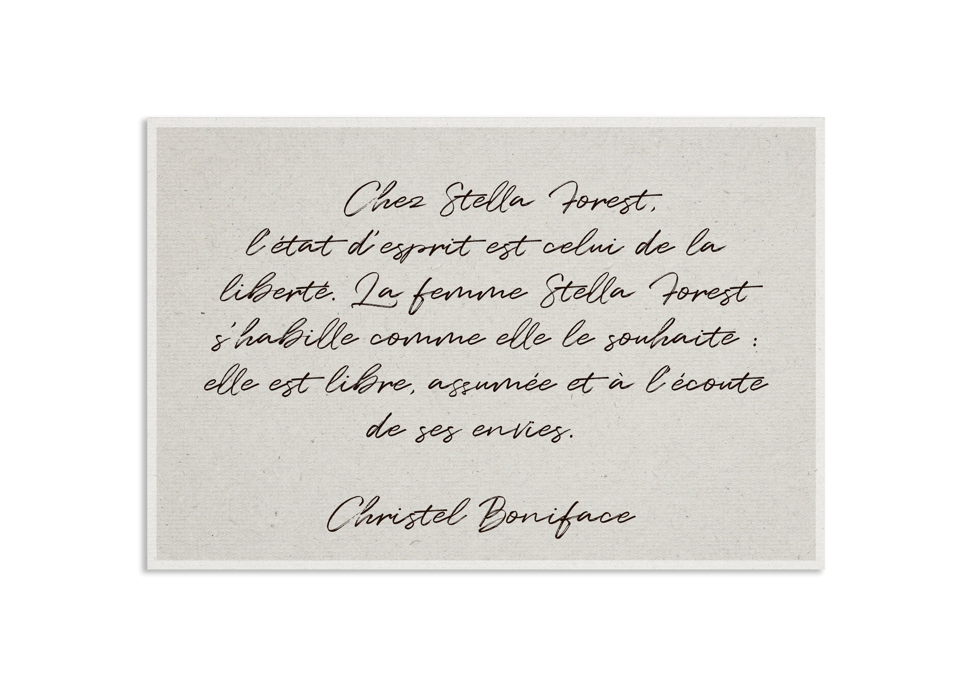 Created nearly thirty years ago by Christel Boniface, founder and artistic director of Stella Forest, the brand reflects her unique sensibility.