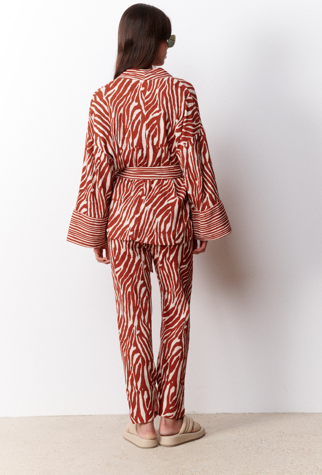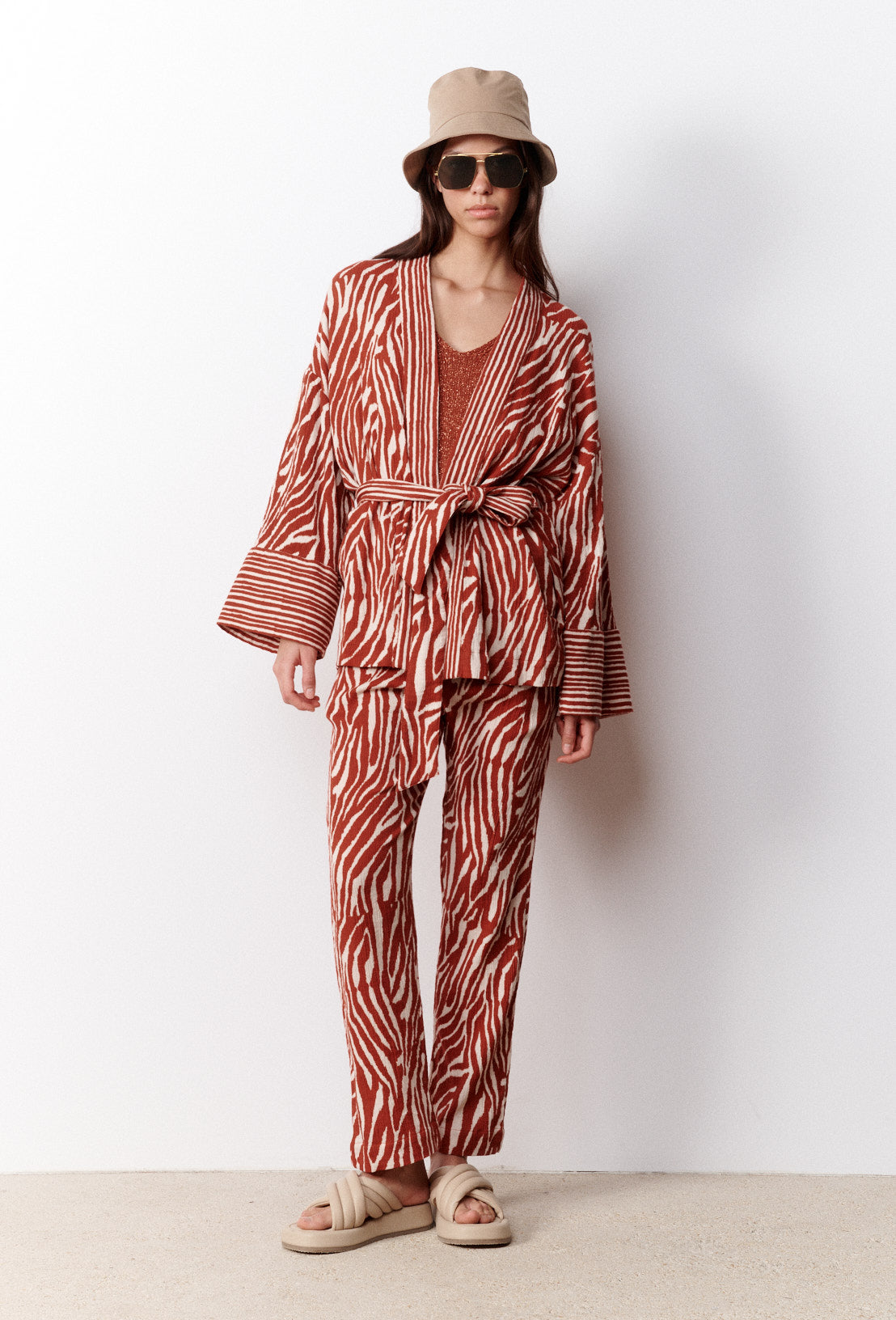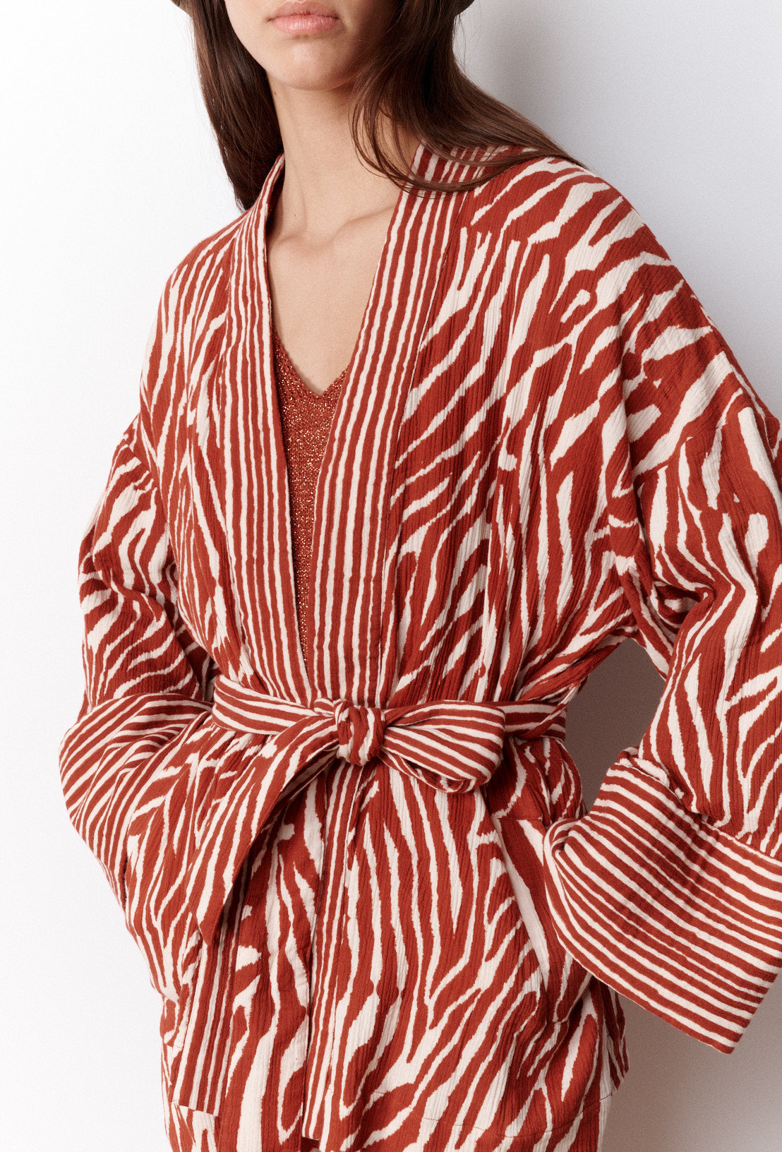 Découvrez Ingrida, notre kimono en coton à imprimé zébré. Sa matière en coton, douce et légère offre un confort absolu. Poignets évasés larges et poches sur les côtés. Ceinture amovible à nouer selon vos envies. Coupe légèrement ajustée en milieu de piècepour souligner les courbes de votre taille. Se porte sur un jean ou une jupeou avec le pantalon Ingrida pour un total look.