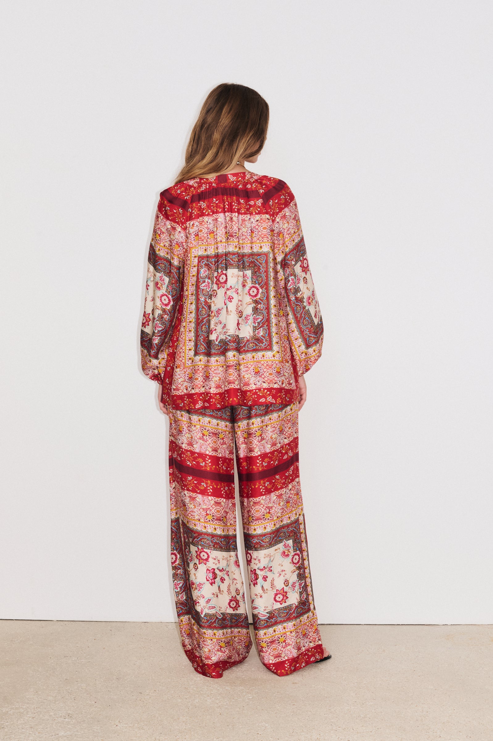 Cette tunique manches longues, en tissu fluide imprimé Made in Como, allie confort et sophistication. Ses manches bouffantes, ses poignets élastiqués, les fronces au col et au bas, ainsi que l’encolure ouverte avec bouton nacré apportent de la légèreté et du mouvement à la silhouette.