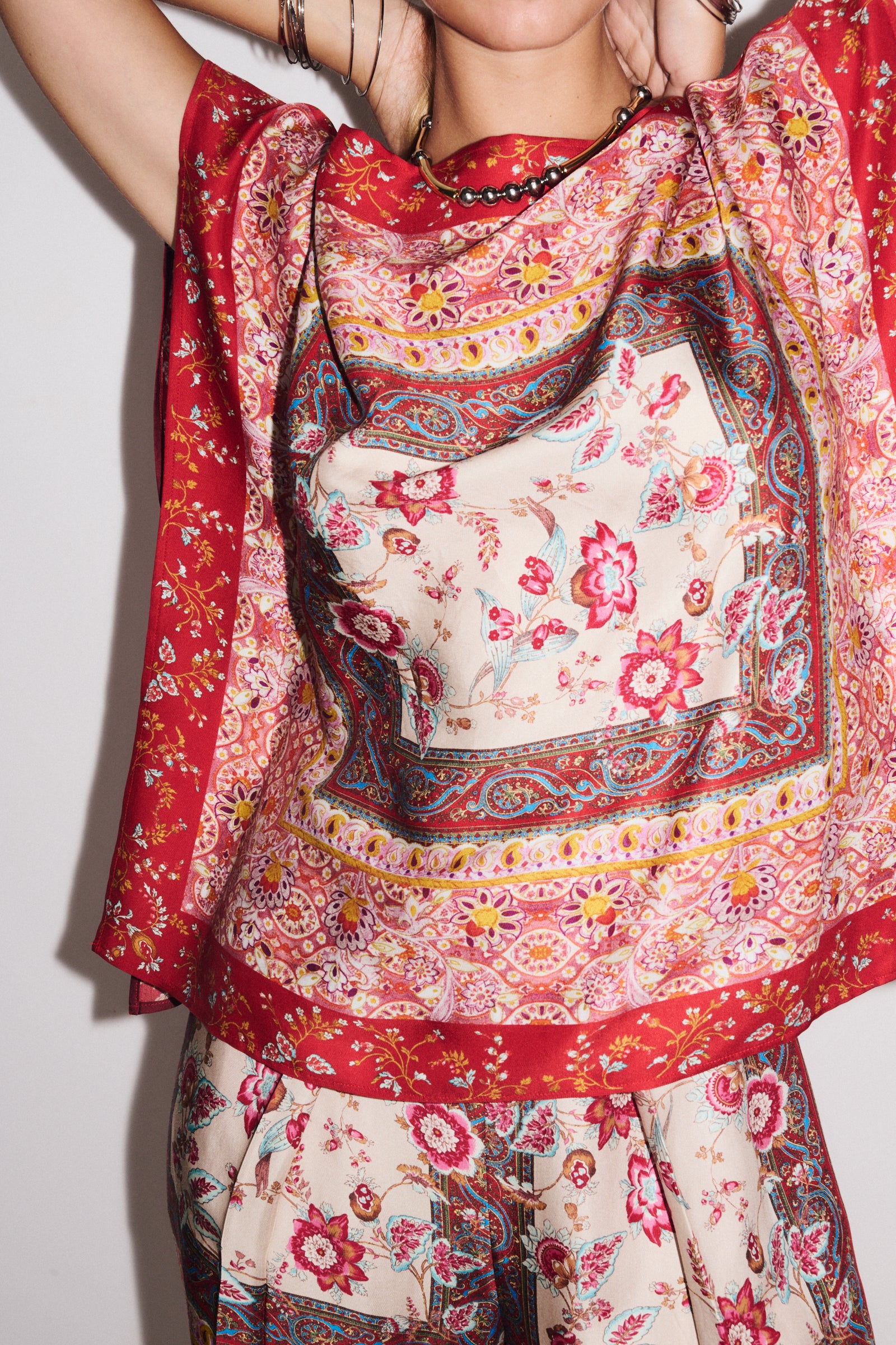 Voir le lookInspirée des carrés de soie et réalisée dans un tissu fluide imprimé Made in Como, la tunique Romance adopte un effet trompe-l’œil foulard pour un look chic et raffiné. Polyvalente, elle se porte aussi bien pour une occasion cérémonielle que de façon casual.