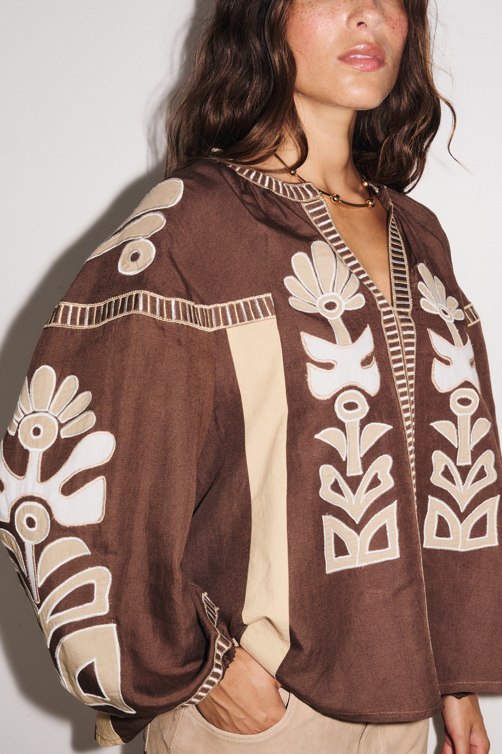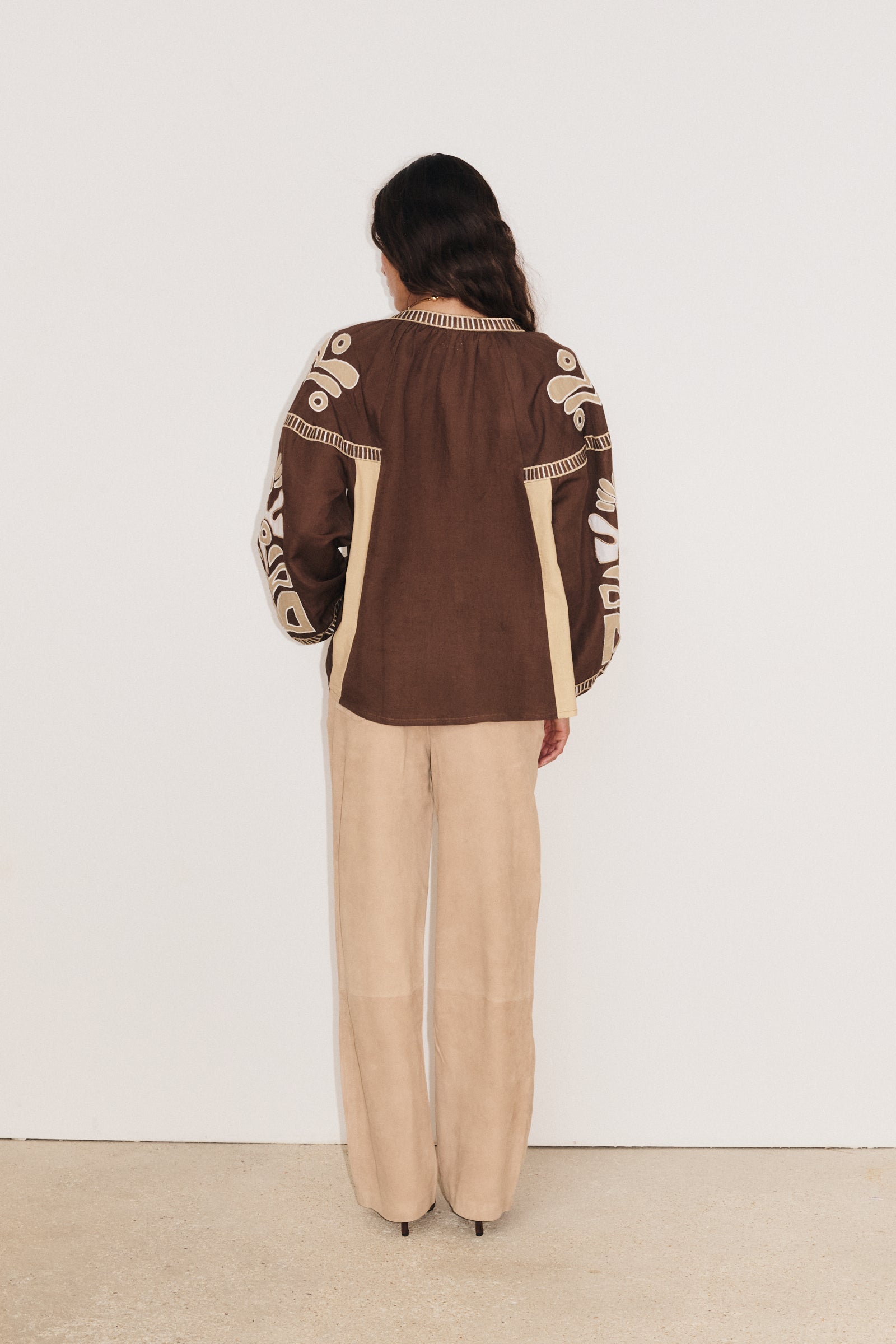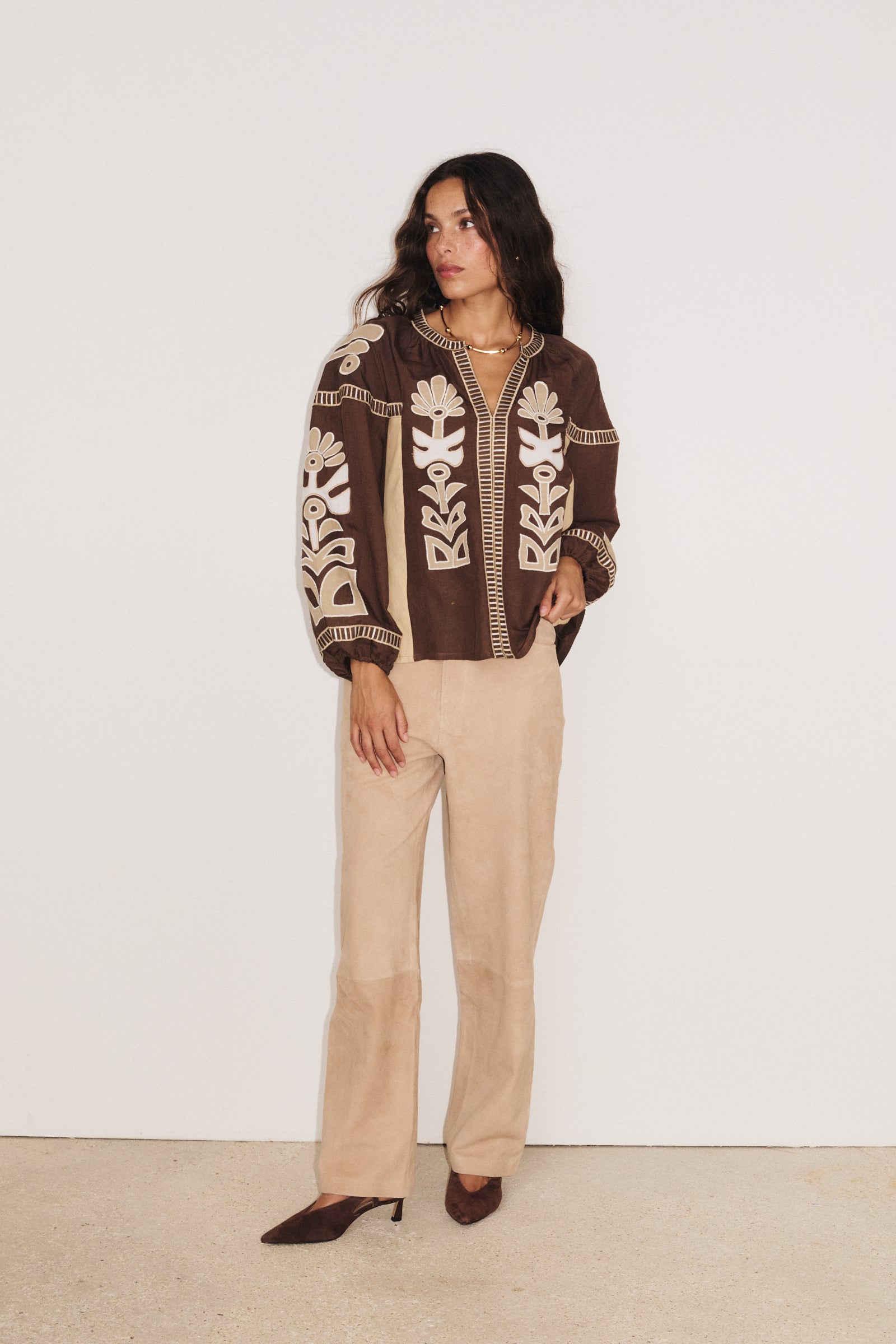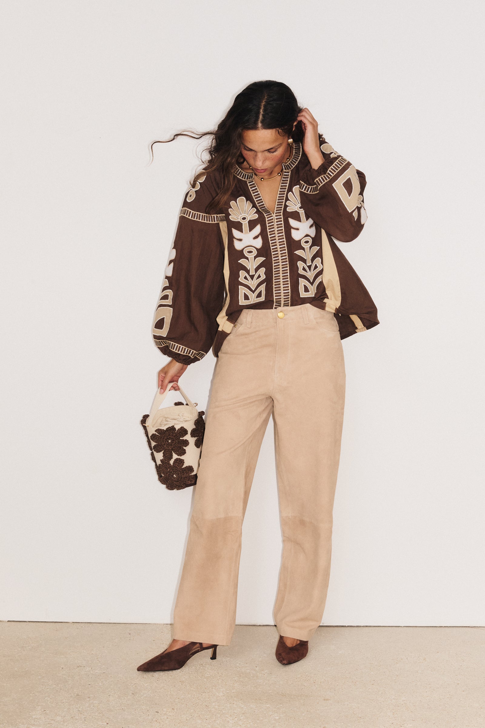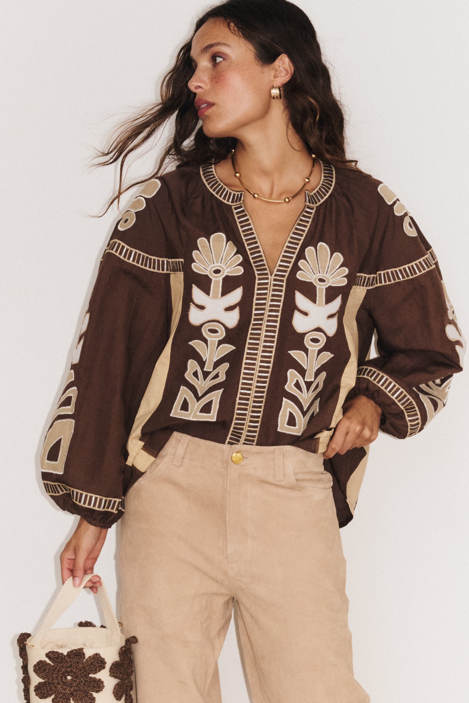 Associez-la à un jean blanc ou un pantalon fluide pour mettre en valeur son tombé léger. Son cintrage discret sous la poitrine structure la silhouette tout en gardant l’esprit bohème chic.