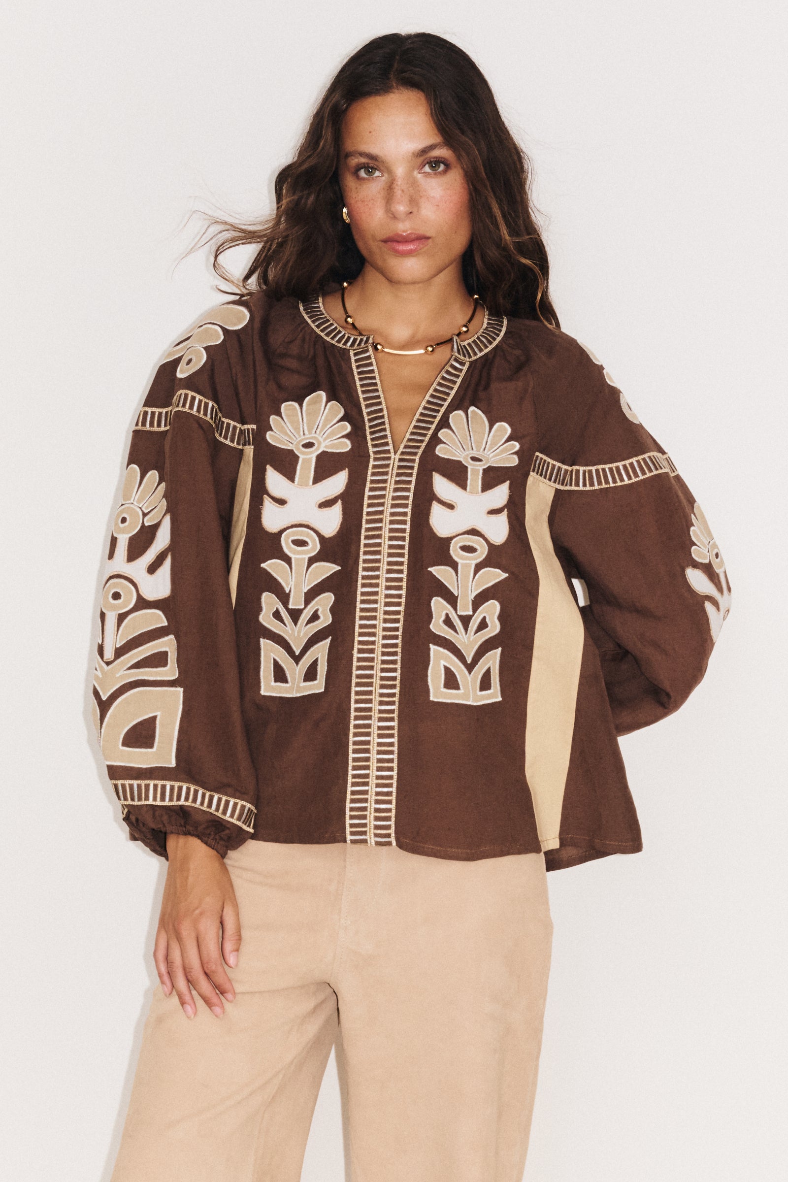 Voir le lookCette tunique séduit par son esprit ethnique délicat et sa coupe naturellement flatteuse. Légèrement cintrée sous la poitrine, elle offre une silhouette élégante et confortable, pensée pour accompagner vos looks du printemps à l’automne avec style et confort.