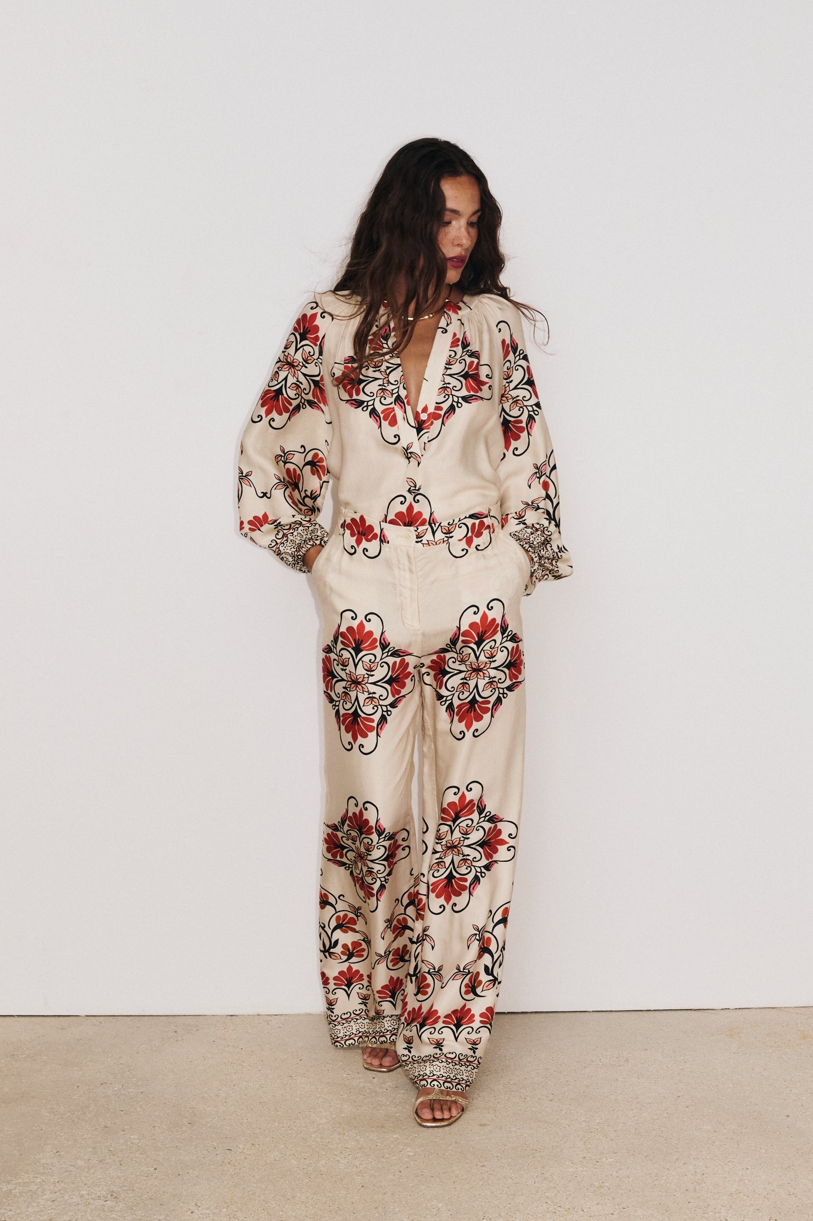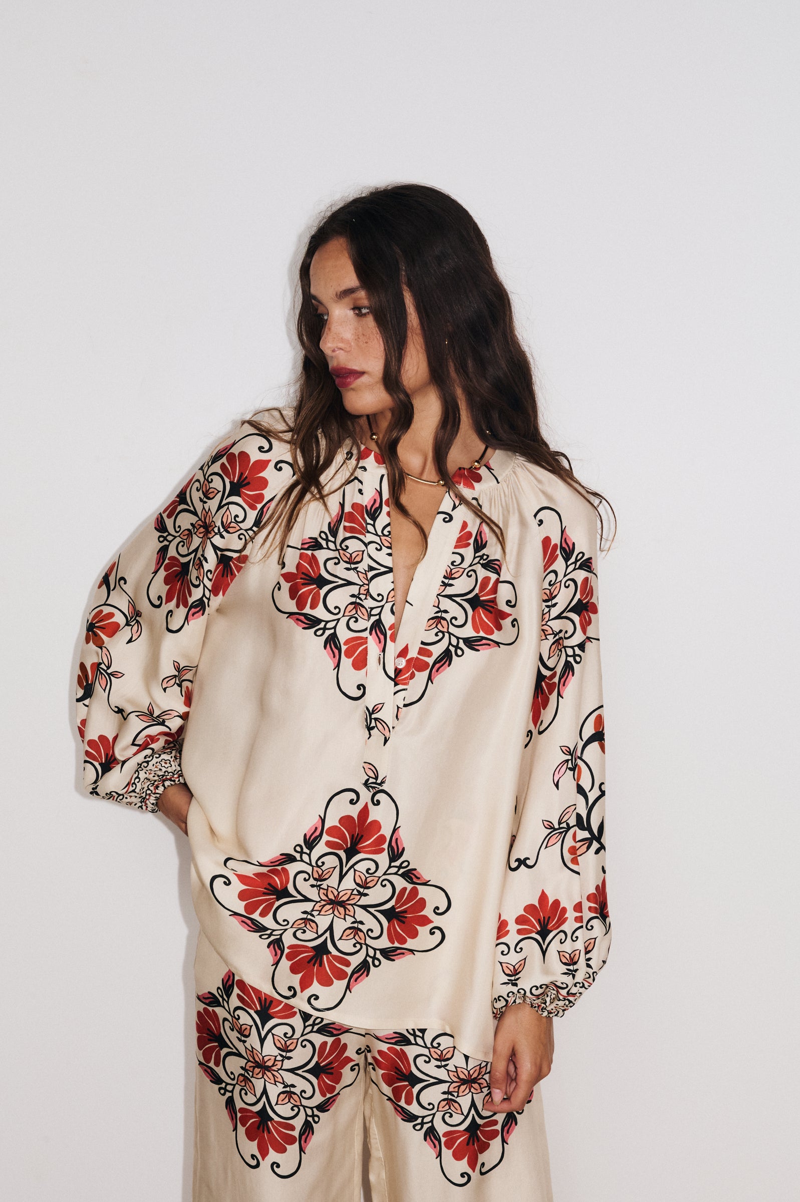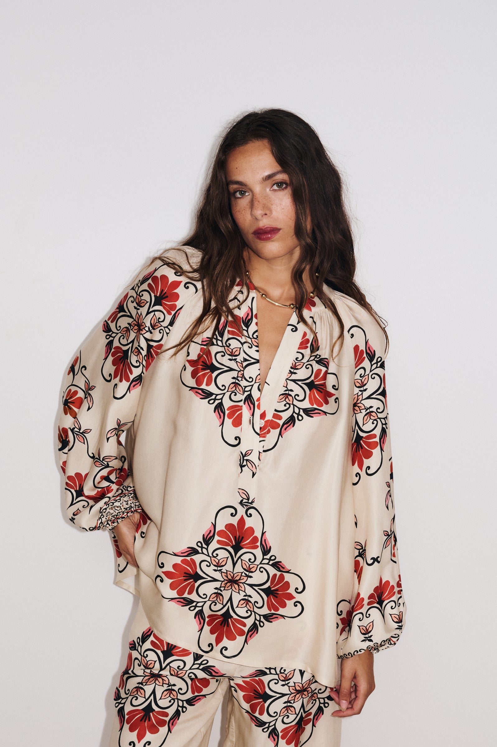 Voir le lookConfectionnée en tissu fluide imprimé Made in Como, la tunique Cleliana se distingue par ses manches bouffantes, poignets élastiqués, fronces au col et au bas, et encolure ouverte avec petit bouton nacré. Une pièce chic et versatile qui apporte élégance et confort à vos tenues.