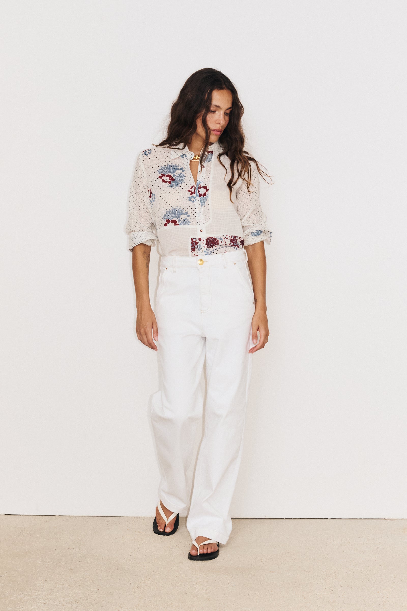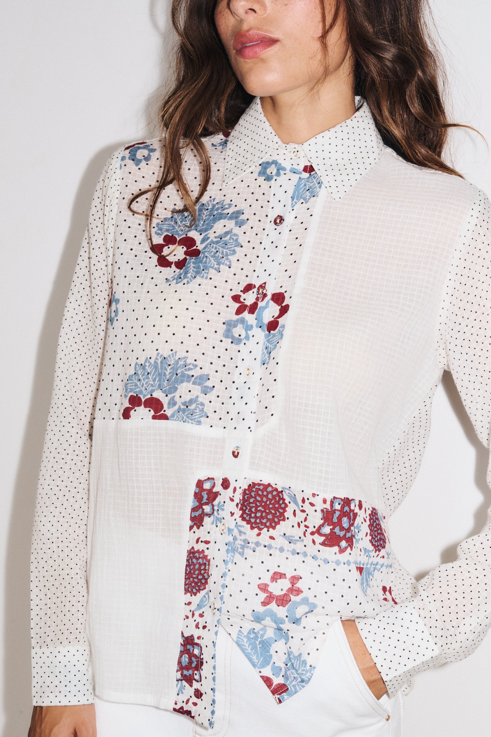 La chemise à manches longues Sunny séduit par son jeu de patchs qui crée un effet mix & match original. Les imprimés floraux se mêlent aux motifs à pois pour apporter caractère à la pièce. Sa coupe reprend le fit de la chemise classique, offrant une silhouette facile à porter au quotidien. Polyvalente et moderne, elle s’associe naturellement à un jean pour un look simple et stylé.