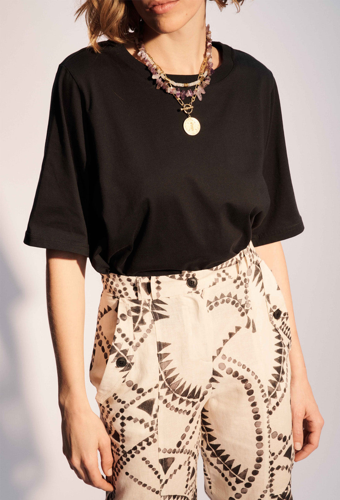 Le pantalon Maneva en coton de lin se distingue par son imprimé oversize réalisé manuellement au tampon et retranscrit en impression sur tissu. Sa coupe est carotte et sa taille est haute. Détails de double passants et de poches italiennes à rabats, fentes en bas de pantalon. Se décline en jupe longue, chemise et robe longue.