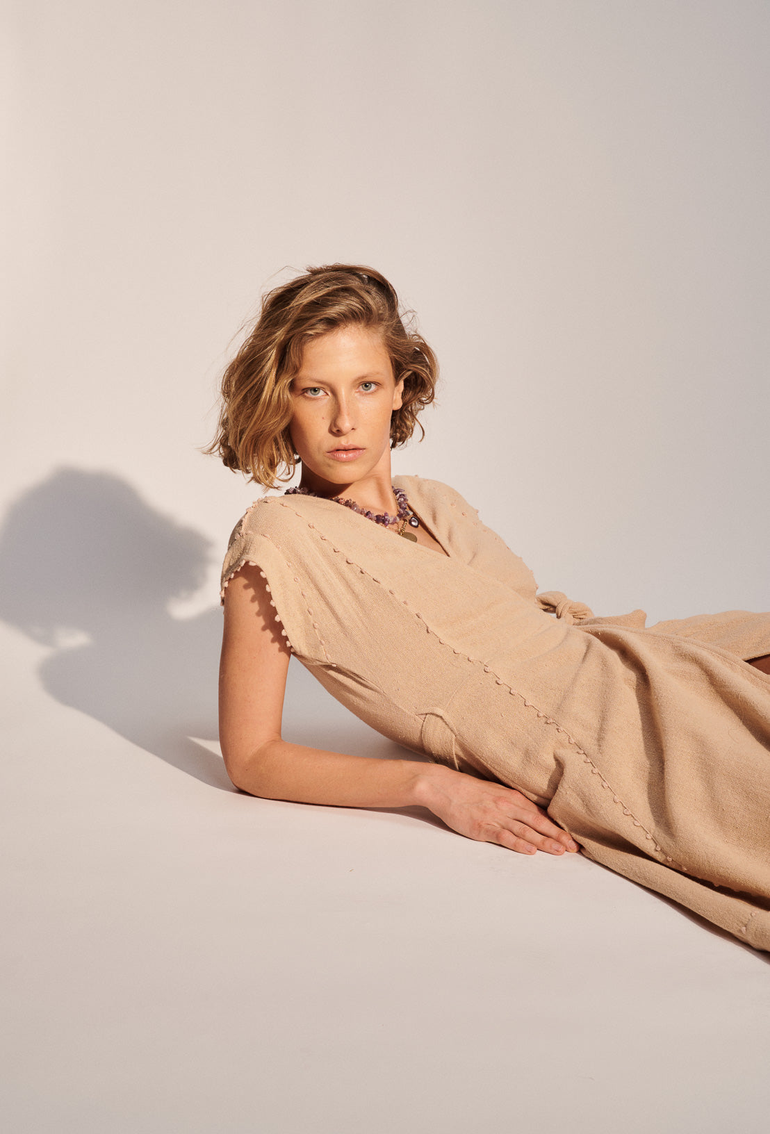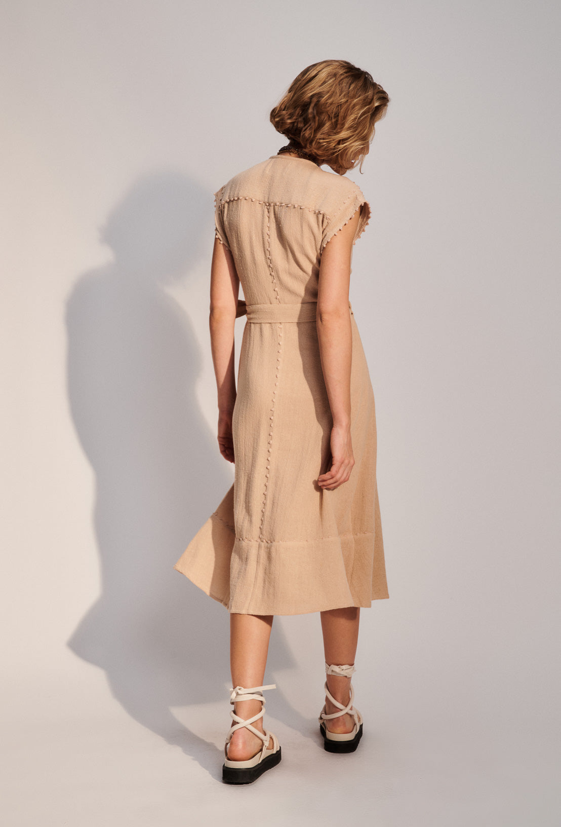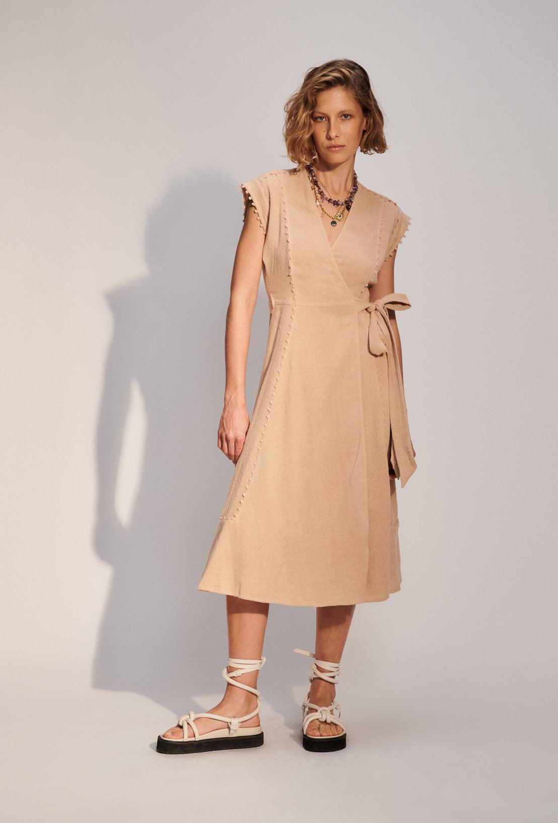 Barbara, c'est notre robe portefeuille sans manches en toile de coton rustique. Sa coupe est cintrée à la taille puis légèrement évasé sur le bas de la robe. Longueur midi. Son petit plus ? les incrustations de petits pompons le long du jupon. Se décline en jupe et kimono.