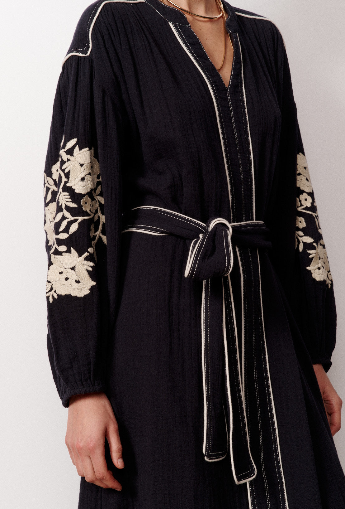 Gabriella, c'est notre robe brodée confectionnée en double gaz lavé. Sa coupe droite est légèrement évasée. Détail de surpiqûres contrastées sur les contours de la robe. Manches légèrement bouffantes. Son petit plus ? Ses broderies florales exclusives Stella Forest sur les manches rappellent le style sophistiqué de la milanaise. Ceinture à la taille pour souligner la silhouette. Robe déclinée en deux coloris.