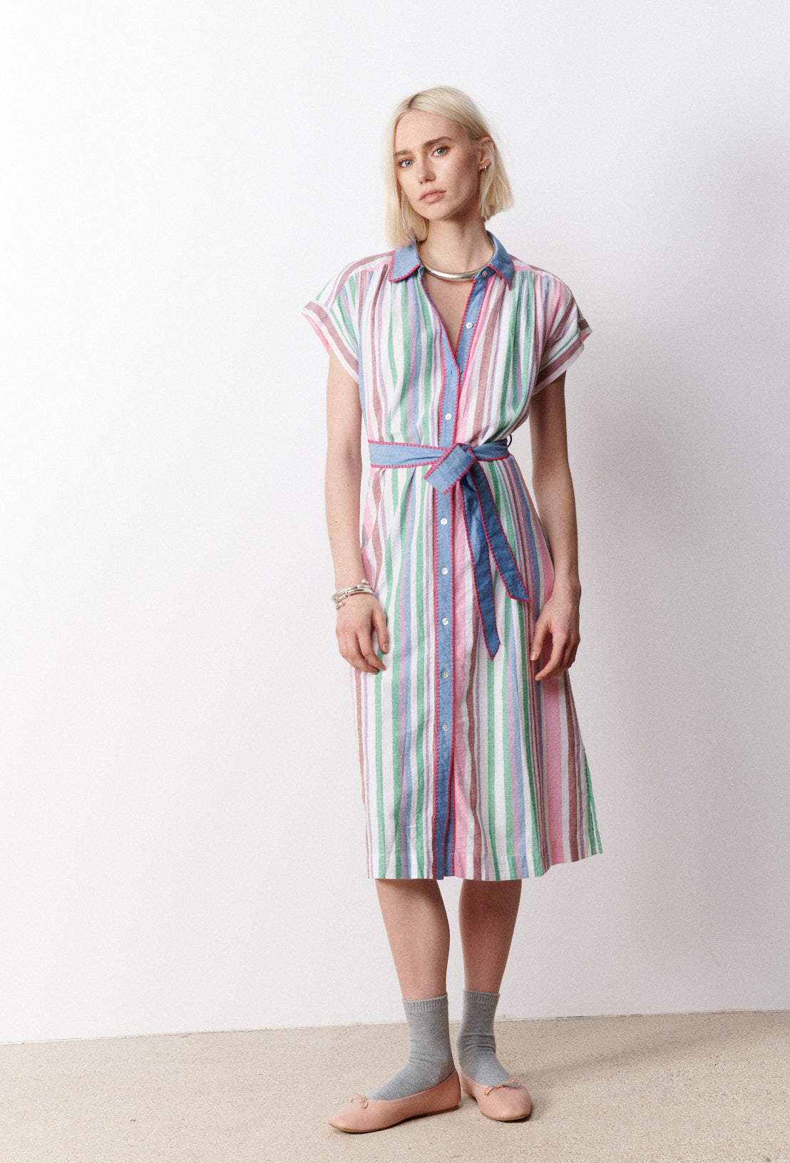 Giuseppa, c’est notre robe chemise longue à rayures bayadères. Col contrasté uni rehaussé d'une surpiqûre fantaisie qui se poursuit sur la patte de boutonnage ainsi que sur la ceinture amovible. Boutons nacre. Détail de fentes sur les côtés. Légèrement arrondie en bas de pièce. Laissez-vous séduire par les rayures bayadères rose buble gum, vert menthe et bleu régate qui rappellent les glaces italiennes. Robe souple et légère qui se décline en plusieurs modèles.